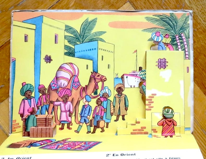 Vevey, Editions Mondo, 1994. In-8, cartonnage couleurs. 5 tableaux en pop-up, avec tirettes et roulettes.